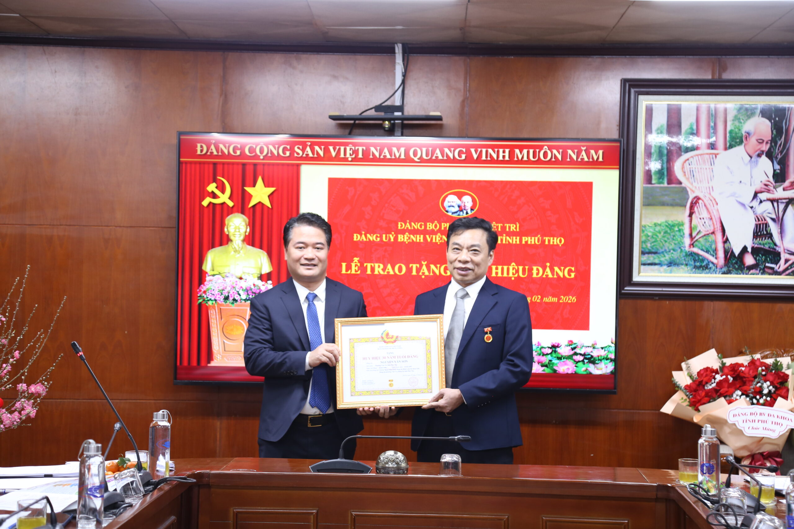 Chiều ngày 02/02/2026, Đảng bộ Bệnh viện Đa khoa tỉnh Phú Thọ đã long trọng tổ chức Lễ trao tặng Huy hiệu 30 năm tuổi Đảng cho đồng chí Nguyễn Văn Sơn – Phó Giám đốc Bệnh viện Đa khoa tỉnh Phú Thọ, Đảng viên Chi bộ Ngoại Thần kinh, trực thuộc Đảng bộ Bệnh viện Đa khoa tỉnh Phú Thọ. Đây là sự kiện có ý nghĩa sâu sắc, thể hiện sự ghi nhận, trân trọng của Đảng bộ Bệnh viện đối với quá trình rèn luyện, cống hiến bền bỉ của người đảng viên trong suốt chặng đường 30 năm đứng trong hàng ngũ của Đảng Cộng sản Việt Nam.